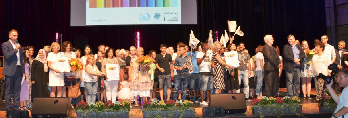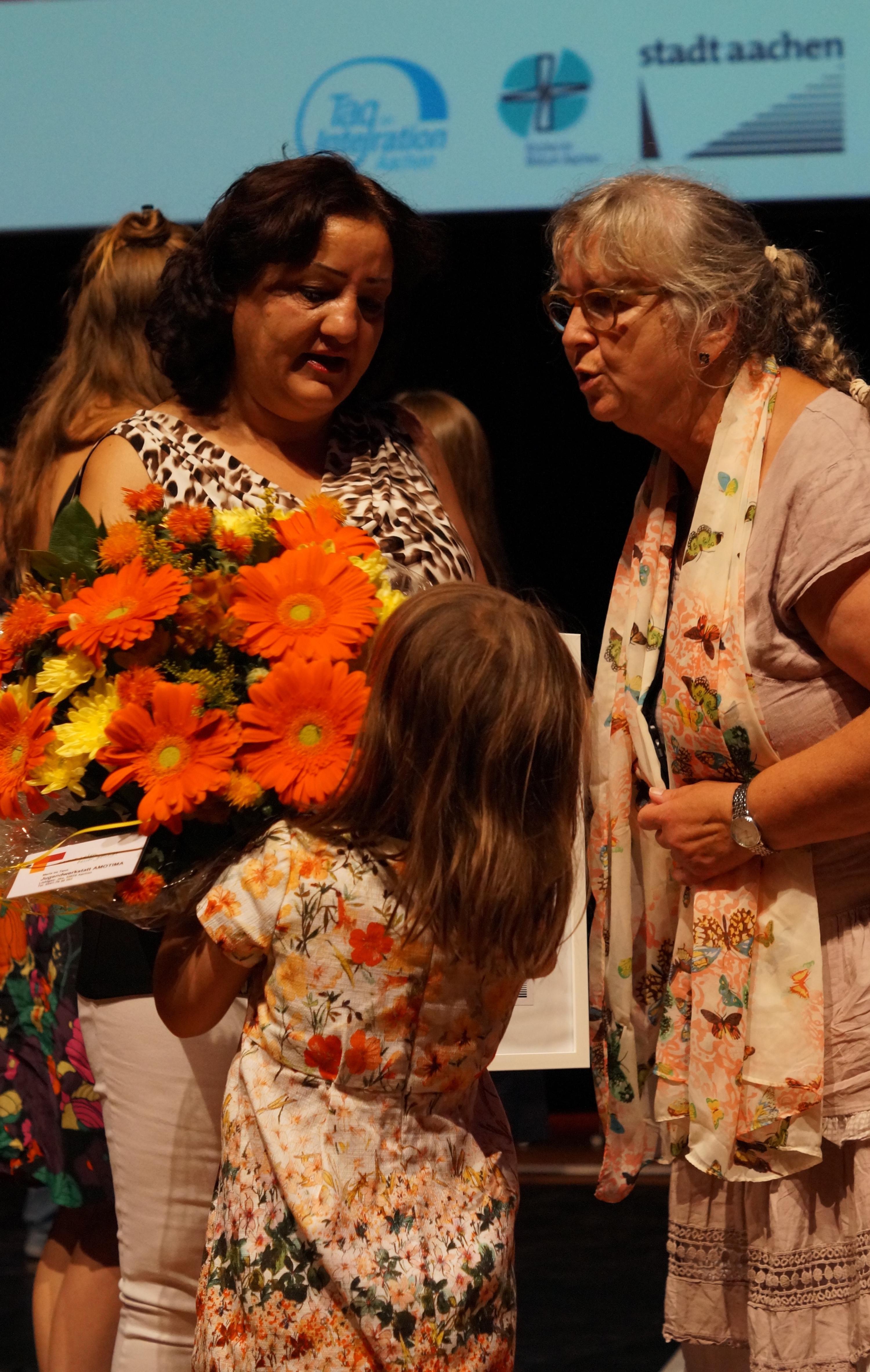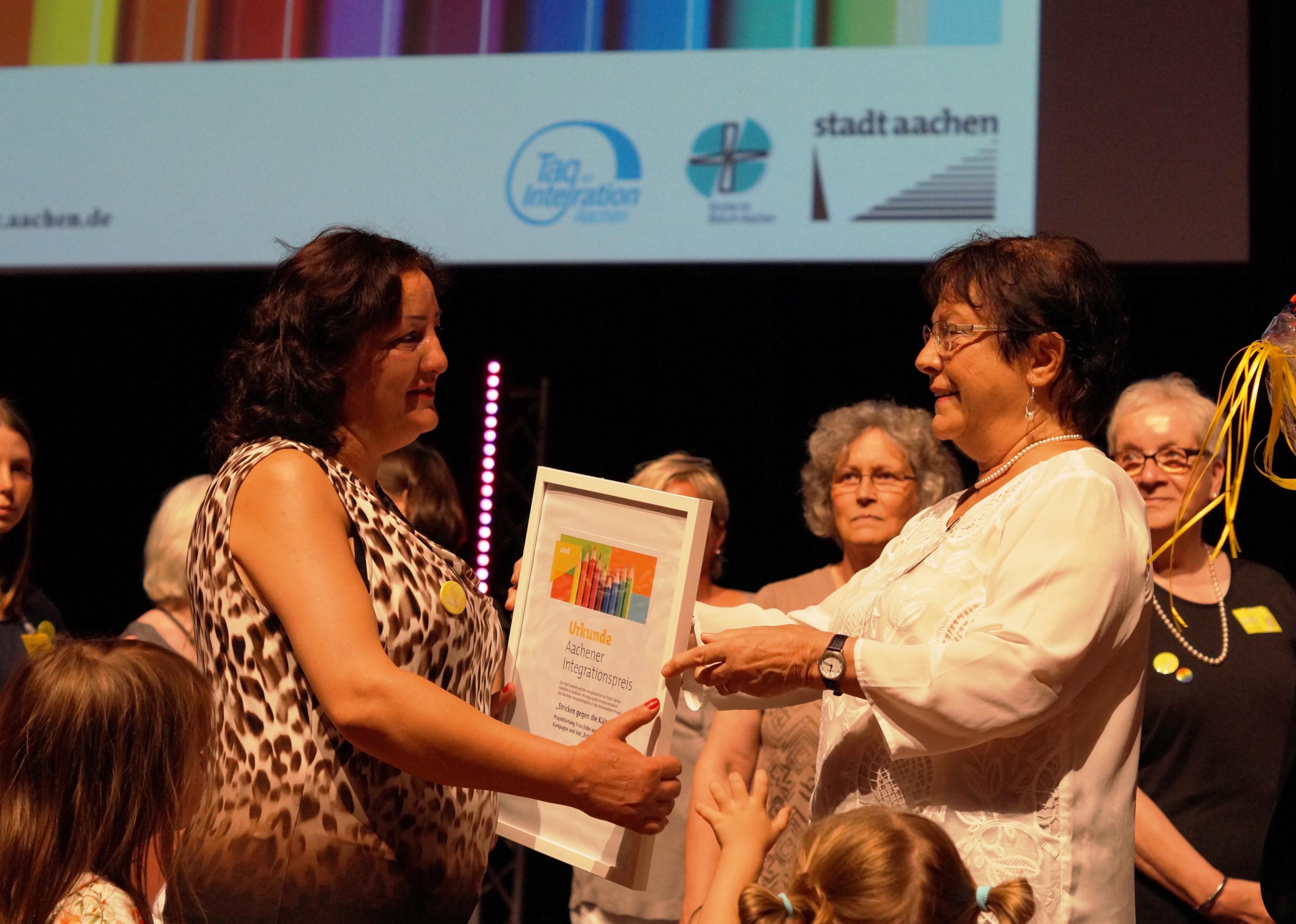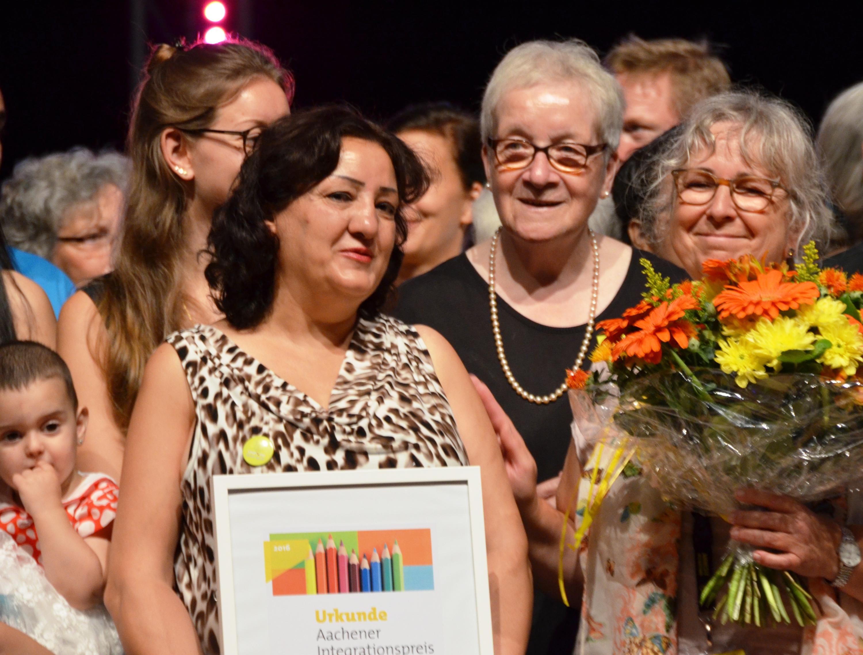 Der Integrationspreis der Stadt Aachen wurde am 10. Tag der Integration (28.August 2016) an die Save-me-Kampagne und da im Besonderen an unser Strickcafé „Stricken gegen die Kälte“ verliehen. Stellvertretend für alle Engagierten nahm Faesa den Preis entgegen.