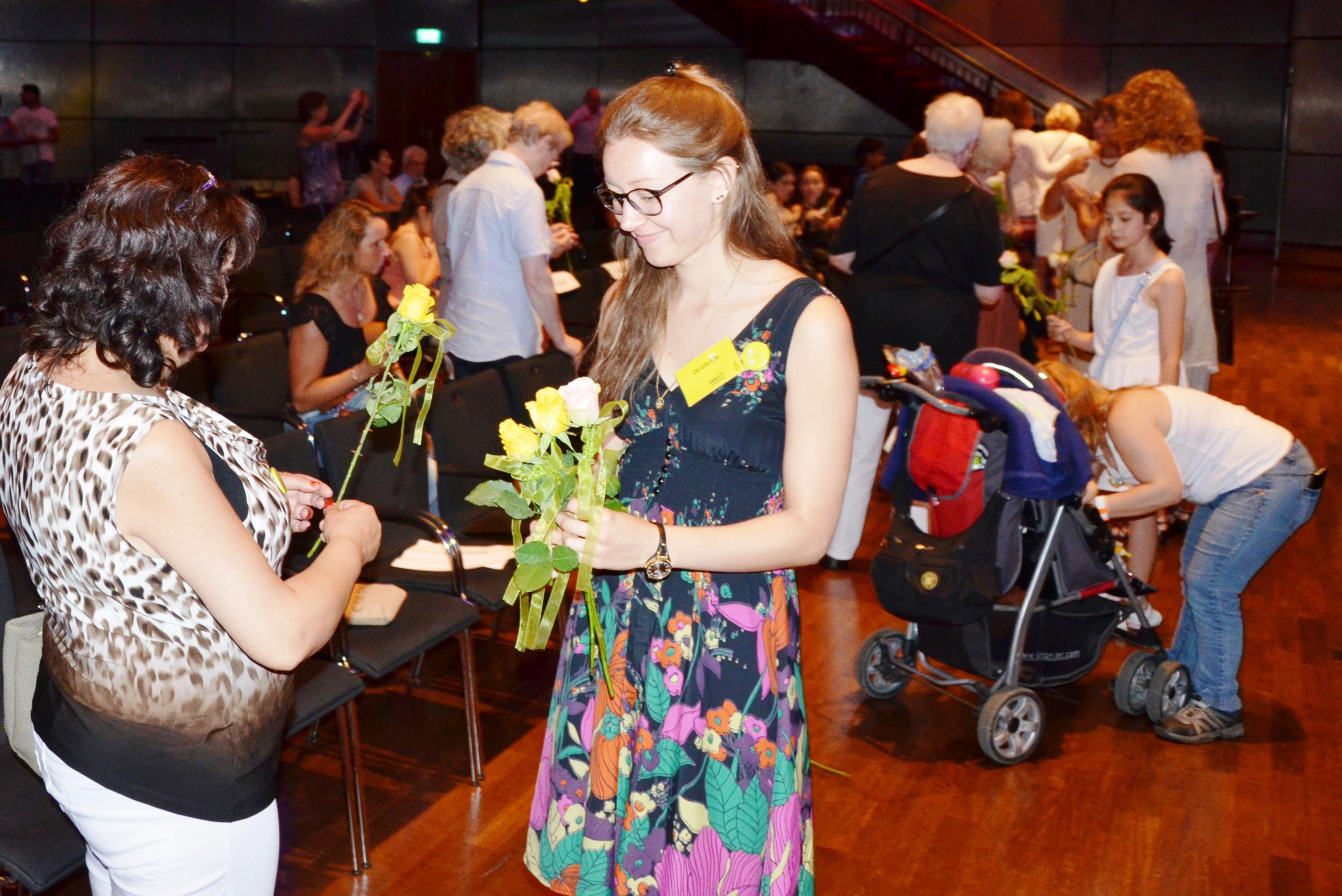 Da die Kampagne nicht das Werk von Einzelpersonen ist, sondern viel Unterstützung auf vielen Ebenen zum Erfolg beiträgt, bedankten wir uns nach der Preisverleihung bei allen rund um das Strickcafé Engagierten mit einer Rose, die ein save-me-grüne Schleife hatte. Herzlichen Dank an alle, die die Save-me-Kampagne mittragen und denen wir heute keine Rose überreichen konnten!